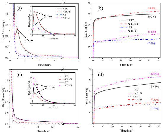 (a,b) Normalized heat flow and normalized heat of the γ-C2S hydration in Na+ activation system, (c,d) Normalized heat flow and normalized heat of the γ-C2S hydration in K+ activation system.