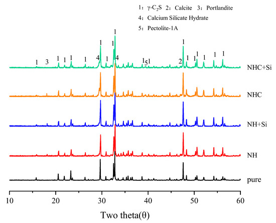 Similar to alkali activation, chemical activation accelerates the dissolution rate of reactants, the precipitation of products, and the generation of hydration products by modifying the pH value of the hydrated slurry. As for NH and KH, the higher pH leads to a decrease in the solubility of Ca2+ in the hydrated slurry, consequently restricting the hydration rate. Nevertheless, NHC and KC release CO32−, which increases the pH and accelerates the dissolution of Ca2+ (reacting with CO32− to form CaCO3), thereby promoting hydration [7]. Moreover, the total cumulative exothermic amount increases for each hydration sample in the presence of nano-SiO2, indicating the enhanced hydration degree of the activation groups by nano-SiO2.