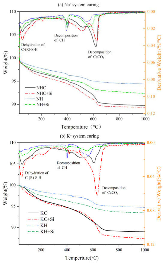 As shown in Figure 7a, a new mass loss is observed for NHC+Si-activated paste in the range of 200–300 °C, which can be caused by the decomposition of sodium silicate and amorphous calcium carbonate (calcium carbonate formed by the carbonation of C-(R)-S-H) [22]. The increase in mass loss before 100 °C in NHC+Si-activated paste and the absence of mass loss at 400 °C are attributed to the pozzolanic effect of nano-SiO2, which consumes Ca(OH)2 and promotes the generation of C-(R)-S-H [26]. A new mass loss is observed in the NHC+Si-activated paste at around 500 °C, indicating the decomposition of amorphous calcium carbonate [22]. As shown in Figure 7b, an additional peak is observed in the K+ activation system below 200 °C, which is attributed to the decomposition of amorphous calcium carbonate. Furthermore, the figure demonstrates that CaCO3 formed by the carbonization of Ca(OH)2 tends to decompose around 550 °C, whereas CaCO3 formed during hydration decomposes at a higher temperature of about 650 °C.