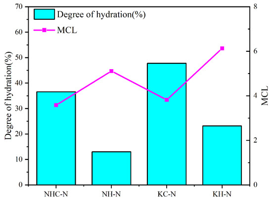 The MCL serves as an effective indicator of the degree of silicate polymerization within the C-(R)-S-H phase. As shown in Figure 10, despite the NH+Si- and KH+Si-activated pastes having lower C-S-H contents, they exhibit higher average silicate chain lengths (5.11 and 6.13, respectively). This phenomenon can be attributed to the low Ca/Si of the NH+Si- and KH+Si-activated pastes, which helps maintain the integrity of the [SiO4]4− tetrahedral structure [33]. As a result, they exhibit a heightened level of silicate polymerization. Additionally, the results show a marginally superior polymerization degree of C-(K)-S-H gels compared to that of C-(N)-S-H gels. This trend can be attributed to the high capacity of C-S-H gels to retain potassium ions in contrast to sodium ions. Due to the small ionic radius of potassium ions, potassium cations exhibit a more vital coulombic interaction, allowing them to penetrate the C-S-H gel structure and counterbalance the negative charge within the C-S-H layer. Potassium ions and water molecules occupy the parallel channels between the silica tetrahedra layers, which creates notably strong hydrogen bonds, consequently enhancing the aggregation density of C-(K)-S-H gels [9]. In contrast to potassium salts, sodium cation is retained in the C-S-H structure by displacing calcium ions and compensating the OH− group charge in the structure. Nevertheless, they are only retained at the terminus of the C-S-H gel structure, leading to a lower retention capacity than potassium ions [34,35]. Consequently, a variation in signal intensity arises between Q1 and Q2, which influences the degree of silicate polymerization.