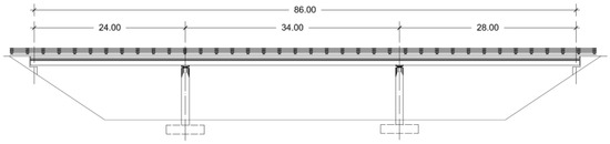 The objective of this study is to optimize the embodied energy of prestressed concrete road flyovers using a two-phase Kriging surrogate model. To achieve this, this new metamodel has been applied to improve the prestressed lightweight slab bridge deck design with spans measuring 24-34-28 m, a configuration commonly found in flyovers spanning double-lane and double-track motorways. As depicted in Figure 1, the cast-in-place slab maintains a uniform depth and follows a straight-line layout. The deck has a width of 8.30 m, accommodating two 3.50 m lanes, a 0.65 m guard rail on each side, and a concrete pedestal (see Figure 2).