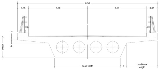 The variables under consideration included the concrete’s simple compressive strength and depth and width dimensions on the various decks’ cross-sections (Figure 2). The remaining dimensions and lightweight components are derived from the relationships outlined in Table 1. Consequently, the concrete’s characteristic strength was modified, ranging from 30 to 50 MPa. The depth ranges from 1.15 m to 1.70 m, with 0.05 m increments, while the width of the section ranges from 3.00 m to 5.00 m, with 0.05 m increments. The maximum span length of the cantilever (v) depends on the bottom base (b), creating an interdependence between these variables. This interrelation can be problematic, as extended cantilever lengths may not be compatible with specific bottom width values, where the combined summation of the bottom width and the lengths of the cantilever should be, at most, the total width of the deck. The voids under consideration are consistently circular, and the external cross-section solely determines their placement within the cross-section. The shear reinforcement and the prestressing tendons need to be positioned within the void cross-section webs. Achieving the required prestressing level may necessitate employing more than one cable per web. It is necessary to integrate the shear reinforcement with the prestressing layout.