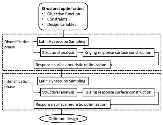 To achieve higher accuracy in the response, the slowest part of conventional optimization, namely structural analysis and objective function evaluation, is substituted with metamodel predictions. As a result, the computational cost for metamodel-based optimization is significantly reduced compared to conventional methods. For example, Penadés-Plà et al. [22] found that Kriging can reduce computational cost by 99.06%. This model’s use allows for the resolution of computationally intensive structural problems while simplifying the complexity of other issues. Figure 3 illustrates the process flow diagram.