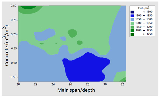 Contour plot of embodied energy with respect to main span/depth and concrete quantity.
