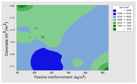 Contour plot of embodied energy with respect to passive reinforcement and concrete quantity.