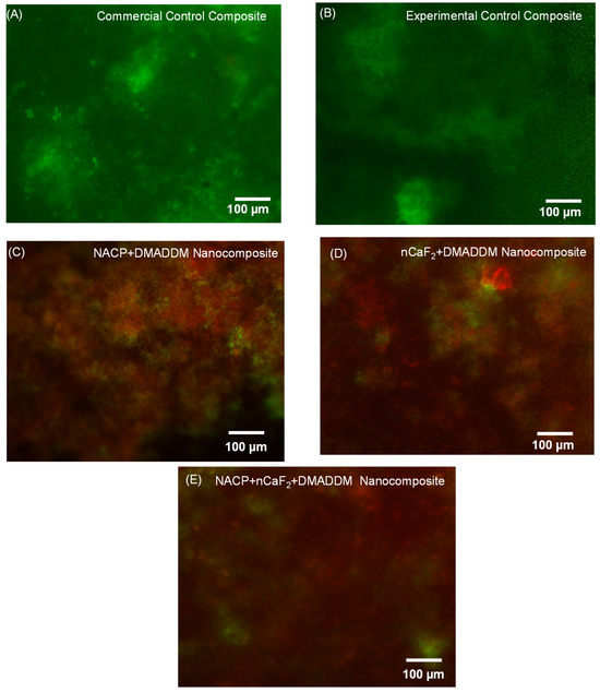 Figure 1 depicts the biofilm-covered composite surface at 48 h. The control groups’ surface showed salivary biofilms predominantly consisting of live bacteria. However, the nanocomposites incorporating DMADDM with NACP, nCaF2, or both inhibited salivary biofilm growth, as indicated by red staining.