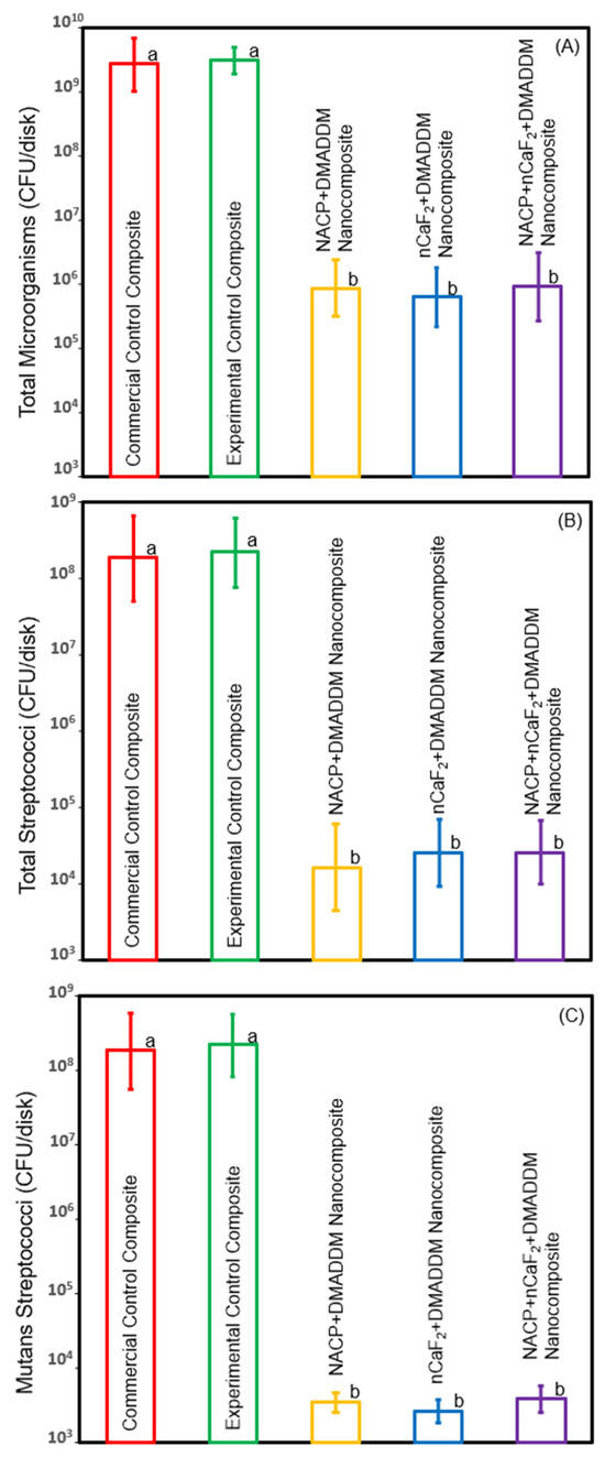 Biofilm colony-forming unit (CFU) counts on composite samples . (A) Total microorganisms (TSA); (B) Total streptococci (MSA), and (C) Mutans streptococci (MSB). The control groups demonstrated the most extensive biofilm growth. The innovative formulations, containing DMADDM with NACP, nCaF2, or both, significantly reduced salivary biofilm development compared to the commercial control (p < 0.05). These formulations substantially decreased salivary biofilm growth by 3–4 orders of magnitude compared to controls (p < 0.05). Dissimilar letters indicate values that are significantly different from each other (p < 0.05).