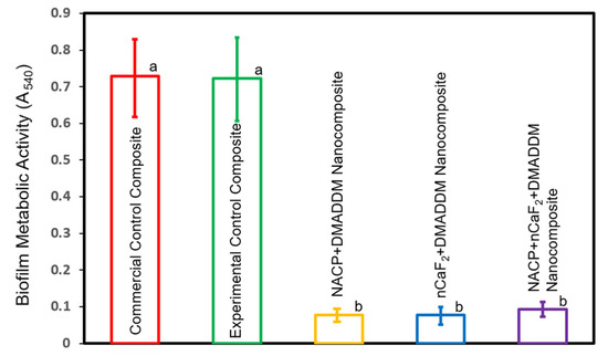 Metabolic activity of biofilms using the MTT assay . The experimental formulations containing DMADDM with NACP, nCaF2, or both achieved a significant reduction in the metabolic activity of salivary biofilms compared to the controls (p < 0.05). Different letters represent values that show significant differences from each other (p < 0.05).