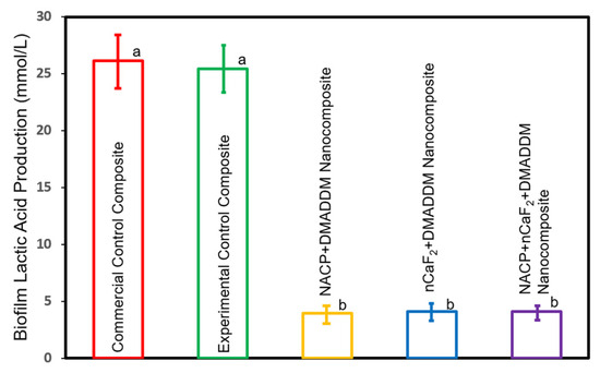 Figure 4 displays the lactic acid production of salivary biofilms formed on the composite surface . The acid production was highest in the control groups (p < 0.5). However, the innovative formulations containing DMADDM with NACP, nCaF2, or both significantly reduced the acid concentration compared to the commercial group (p < 0.05). Nevertheless, there were no significant differences in acid production among these DMADDM-containing groups (p > 0.05).