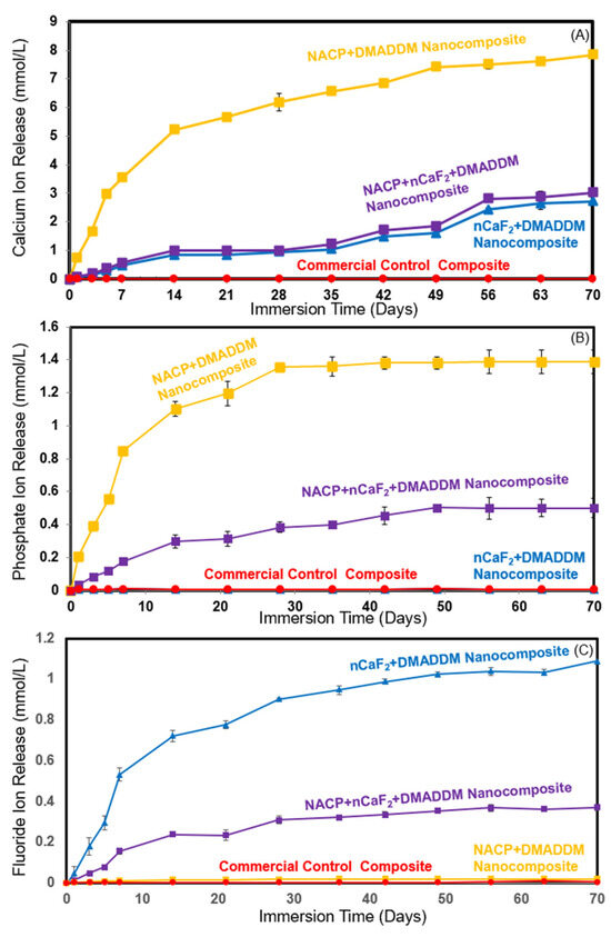 The Ca, P, and F ions released from nanocomposite specimens are plotted in Figure 5. For Ca ion release, at 70 days, the nanocomposite with 20% NACP had the highest Ca ion release at (7.84 ± 0.08) mmol/L (p < 0.05), followed by the nanocomposite with both 10% NACP and 10% nCaF2 (3.02 ± 0.21) mmol/L (p < 0.05) and the nanocomposite with 20% nCaF2 (2.7 ± 0.15) mmol/L (p < 0.05). The commercial control composite demonstrated no release of Ca ions. For P ion release, among all the composite groups, the addition of 20% NACP in the nanocomposite resulted in the highest P ion release at (1.30 ± 0.07) mmol/L (p < 0.05), followed by the nanocomposite containing 10% NACP and 10% nCaF2 (0.5 ± 0.05) mmol/L (p < 0.05). The nanocomposite with 20% nCaF2 and a commercial control composite revealed the lowest results with the close to zero release of the P ion at (0.005 ± 0.001) mmol/L and (0.005 ± 0.001) mmol/L, respectively. (p < 0.05). For F ion release, the nanocomposite with 20% nCaF2 had the highest F ion release at (1.09 ± 0.01) mmol/L, and the nanocomposite with both 10% NACP and 10% nCaF2 had an F ion release of (0.37 ± 0.01) mmol/L (p < 0.05). However, the commercial control and nanocomposite with 20% NACP revealed a limited F ion release at (0.006 ± 0.001) mmol/L and (0.019 ± 0.003) mmol/L, respectively (p < 0.05).
