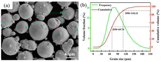 The 304 austenitic stainless steels were used as the substrate material (10 mm ×150 mm ×200 mm). The surface was cleaned with anhydrous ethanol before the laser cladding in order to remove surface oil stains and oxides. A Norem02 iron-based alloy spherical powder with particle sizes ranging from 15 µm to 175 µm was used as the laser cladding material, as shown in Figure 1. Inductively Coupled Plasma Optical Emission Spectrometer (ICP-OES, Agilent, Beijing, China) testing was conducted on Norem02 iron-based alloy powder, and the results are shown in Table 1. The powder was dried and kept warm in a vacuum drying oven at 120 °C for four hours before the laser cladding.