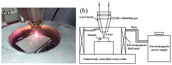 (a) The high-speed laser cladding complete system and (b) schematic diagram of EMF-assisted laser cladding scheme.