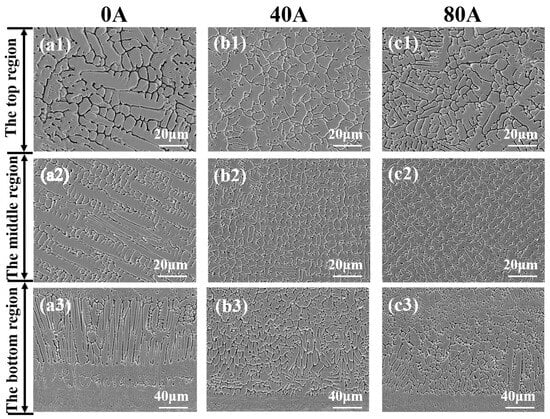 The cross-sectional SEM morphologies in the top, middle, and bottom of the coatings with different EMF current intensities: (a1–a3) I = 0 A; (b1–b3) I = 40 A; (c1–c3) I = 80 A.