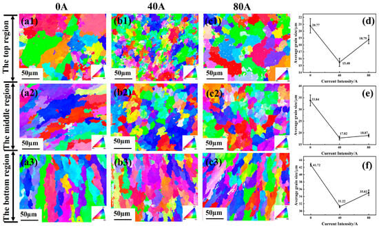 The cross sectional IPF maps and average grain size (d–f) in the top, middle, and bottom of coatings with different EMF current intensities: (a1–a3) I = 0 A; (b1–b3) I = 40 A; (c1–c3) I = 80 A.