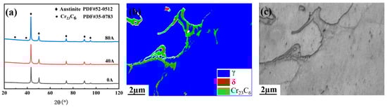 Figure 5 shows that the comparison of the XRD patterns of laser cladding Norem02 coatings under different EMF intensities, EBSD phase diagram and SEM micrograph of the coating with an EMF current intensity of 40 A. EBSD phase diagram and SEM micrograph (Figure 5a,b) indicate that coatings are mainly composed of austinite, ferrite, and carbide (Cr23C6). The carbide (Cr23C6) mainly has a network morphology in austenite crystal, and a small amount of ferrite exists in carbide, forming a mixed zone of ferrite and carbide. Due to the low content of ferrite, only the characteristic peaks of austenite and carbide (Cr23C6) are detected by XRD. The result of XRD indicates that the EMF application during the laser cladding process has little effect on the phase composition of the coating during the solidification process of the laser melt pool. On the other hand, the diffraction peak intensities of the cladding coatings assisted by external EMF increase at approximately 43° and 97° when EMF is applied, which indicates that the EMF increases the content of solid solution [27].