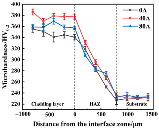 Figure 6 shows that the hardness distribution profile across from the coating to the heat-affected zone (HAZ) and then to the substrate. It is found that a higher hardness is obtained in the coatings compared to that of the substrate, and the hardness gradually decreases from the coating to substrate. Wherein, the average microhardness of the coating without magnetic field assistance is 346.0 HV0.2, and the microhardness slightly decreases from the coating surface to interface, which results from a high cooling rate, high temperature gradient, and rapid solidification of the laser cladding to form a planar crystal region, a columnar dendrite region, and an equiaxial crystal region within the Norem02 iron-based cemented carbide coating [28]. When an EMF current intensity of 40 A, the average microhardness increases to 376.9 HV0.2. However, when the EMF current intensity increases to 80 A, the average microhardness of the coating decreases to 360.5 HV0.2. Obviously, when the EMF current intensity increases, the microhardness of the coating first increases, then decreases. This is due to the formation of a more uniform microstructure induced by the increased flow and unified temperature field of the molten pool under the stir of the electromagnetic force. However, when the EMF intensity reaches 80 A, the coating hardness decreases, because the Joule heat action is greater than the EMF stirring action, which makes the grain coarse at the surface [22].