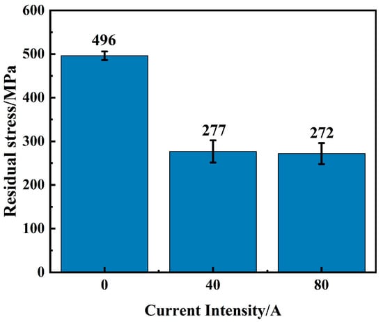 Figure 7 illustrates the residual stresses on the surface of the coatings under various EMF current intensities. It is found that the residual stress on the coating surfaces is tensile stress. Without EMF assistance, the residual stress on the coating surface is 496 MPa. When an EMF of 40 A is applied, residual stress on the coating surface decreases to 277 MPa, which decreases about 44.2%. With an increasing EMF current intensity to 80 A, residual stress on the coating surface slightly decreases to 272 MPa. It is found that the residual stress occurs due to rapid heating and cooling during laser cladding, and thermal effects are the main cause of residual stress [29]. Under the mechanical stirring effect of EMFs on molten pools, EMF can promote the mass transfer process within the molten pools and reduce the temperature gradient, which ensures that the distribution of solute elements and heat within the molten pool is uniform, thus reducing residual stresses.