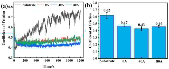 (a) The COF wear–time relationship and (b) average COF of the 304 substrate and the coatings with different EMF intensities.