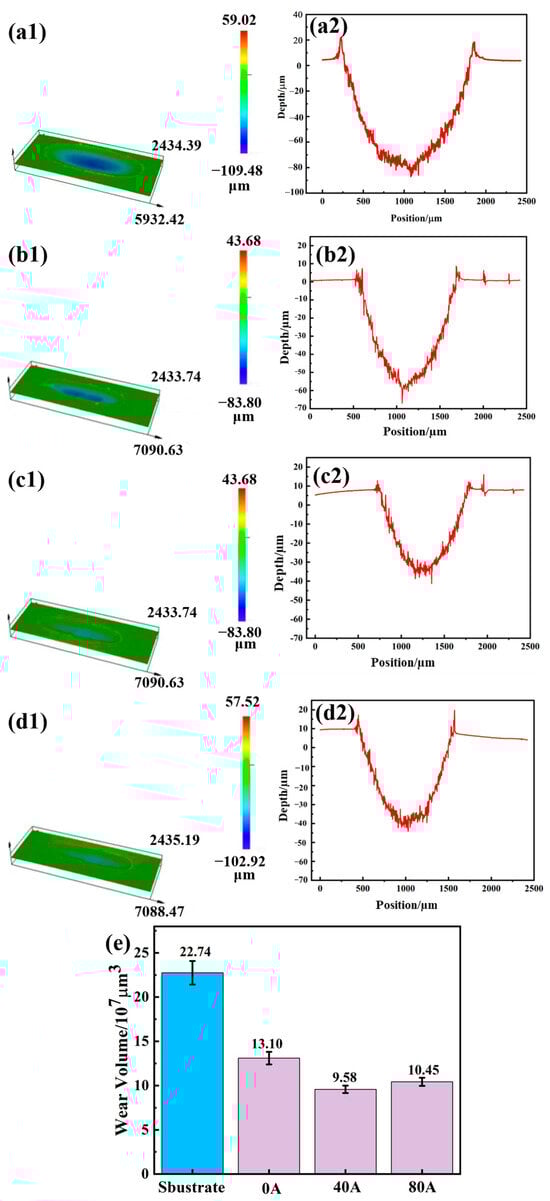Wear 3D morphologies (a1–d1), wear depths (a2–d2) and wear volumes (e) of substrate and coatings with different EMF current intensities.