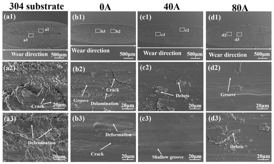 (a1–a3) Overall scar SEM wear morphologies and the magnification ones of the corresponding areas in the 304 substrate and the coatings with different EMF current intensities: (b1–b3) I = 0 A; (c1–c3) I = 40 A; (d1–d3) I = 80 A.