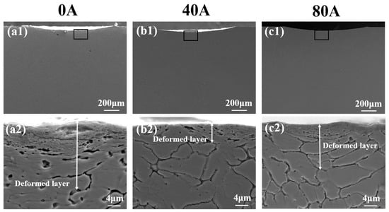 Figure 11 illustrates cross-sectional the SEM morphologies of coatings with different EMF current intensities and magnification images of them. As shown in Figure 11(a1,a2), a thick worn debris with a thickness of about 5 µm and plastic deformation are visible underneath the wear scar in the coating without EMF assistance. The grains in the deformed layer are elongated along the direction of fretting. Several microcracks are also visible in the worn debris, as shown in Figure 11(a2). Compared with those in Figure 11(a1,a2), both the worn debris and the deformation layer thickness in Figure 11(b1,b2) of coating B are small. According to Figure 11(b2), the deformation layer of coating B is small, and there are no cracks, which indicates that its deformation resistance and wear resistance are significantly improved. However, it can be observed in Figure 11(c1,c2) that the wear debris and deformed layer of coating C become thick again, and its thickness reaches approximately 10 µm, which indicates its deformation resistance and wear resistance is lower than that of coating B and the grains in the deformed layer are elongated into thin strips.