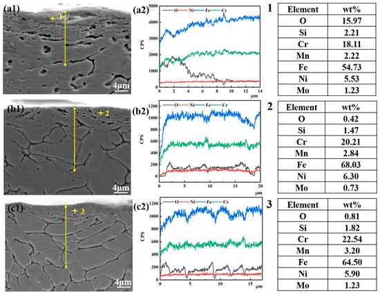 The cross-sectional element analyses of wear scar in the coatings with different EMF current intensities: (a1,a2) I = 0 A; (b1,b2) I = 40 A; (c1,c2) I = 80 A.