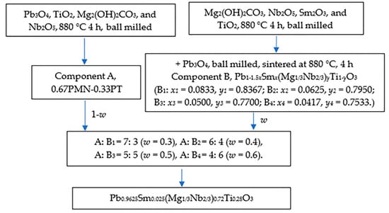 The target formula composition Pb0.9625Sm0.025(Mg1/3Nb2/3)0.72Ti0.28O3 was determined. Using the lever principle in the phase equilibrium calculation method, the chemical components on both sides of the target formula Ti = 0.28 were selected, and one component was doped with Sm. Two components with different crystal phases were pre-synthesized and then mixed, formed, and sintered according to the design proportion to prepare the non-uniform doped ceramic system. To avoid the formation of the pyrochlore phase, niobium and titanium compounds (Nb2O5, TiO2) with poor sintering activity were mixed with strong sintering active Mg2(OH)2CO3, and a small amount of lead oxide was used as a diffusion promoter to synthesize two kinds of pre-sintered powders in advance. Analytical-grade chemicals, Pb3O4 (Aladdin, 99.95% purity), Sm2O3 (Aladdin, 99.99% purity), TiO2 (Aladdin, 99.99% purity), Mg2(OH)2CO3 (Aladdin, 99.99% purity), and Nb2O5 (Aladdin, 99.99% purity), were used as raw materials to synthesize Pb(Mg1/3Nb2/3)0.67Ti0.33O3 (Component A) and Pb1−1.5xSmx(Mg1/3Nb2/3)yTi1−yO3 (Component B, B1: x1 = 0.0833, y1 = 0.8367; B2: x2 = 0.0625, y2 = 0.7950; B3, x3 = 0.0500, y3 = 0.7700; B4: x4 = 0.0417, y4 = 0.7533) ceramic powders. In Component B, Mg2(OH)2CO3, Nb2O5, Sm2O3, and TiO2 were evenly ground and pre-sintered at 880 °C for 4 h, then crushed and Pb3O4 was added. Pb0.9625Sm0.025(Mg1/3Nb2/3)0.72Ti0.28O3 piezoelectric ceramics with the nominal composition were prepared by mixing Component A and Component B according to the chemical formula of (1 − 0.025/x)[Pb(Mg1/3Nb2/3)0.67Ti0.33O3]-0.025/x[Pb1−1.5xSmx(Mg1/3Nb2/3)yTi1−yO3] (0.025/x = 0.3, 0.4, 0.5, 0.6), followed by ball milling, granulation, molding, and sintering processes. The preparation process is shown in Figure 1. To simplify the analysis, we denote w as 0.025/x. The sintering conditions were 1250 °C for 1.5 h. After grinding and polishing, the ceramics were coated with silver paste on both surfaces, and sintered at 650 °C for 30 min to form silver electrodes. The ceramic discs were poled at 3 kV/mm for 1 min in silicone oil at room temperature, aged and short-circuited for 24 h, and then the electrical properties were measured. For comparison, Pb0.9625Sm0.025(Mg1/3Nb2/3)0.72Ti0.28O3 was prepared by the traditional mixed oxide sintering process as a reference sample.