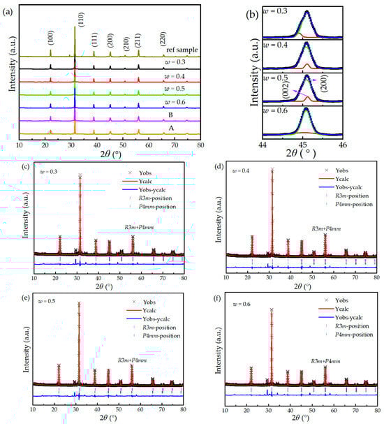 XRD patterns of (a) Component A, Component B, (1 − w)PMNT-wPSMNT (w = 0.3, 0.4, 0.5, 0.6) ceramics, and reference sample (the crystallographic index was calibrated according to the tetragonal phase). (b) Fitting peaks of (1 − w)PMNT-wPSMNT ceramics at 2θ = 44–46°. Rietveld refinement results of (c) w = 0.3, (d) w = 0.4, (e) w = 0.5, (f) w = 0.6.