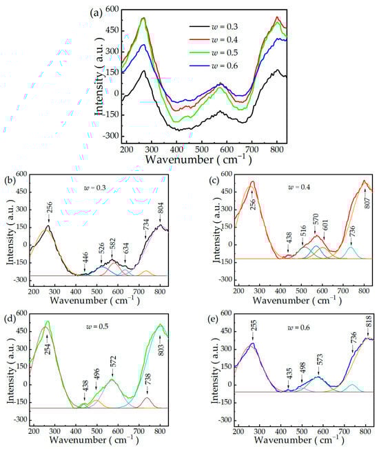 Raman spectra of (a) (1 − w)PMNT-wPSMNT (w = 0.3, 0.4, 0.5, 0.6) ceramics at room temperature; Deconvolution of multiple Lorentzian/Gaussian peaks at 180–840 cm−1 of (b) w = 0.3, (c) w = 0.4, (d) w = 0.5, (e) w = 0.6.