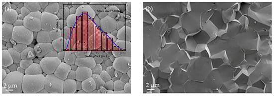 The surface of the ceramic samples was polished and etched at 1000 °C for 1 h before the morphological characterizations. Figure 4 shows that the grain size was relatively uniform in the range of 4–6 μm with an average size of 5.18 μm. It was found that a smaller grain size induced smaller domain sizes, leading to a superior piezoelectric mechanism via the clamping effect during the polarization flip [33,34]. Moreover, the ceramic grains were well-developed with clear grain boundaries and no visible precipitates presented at the grain boundaries. To some extent, the size and distribution of grains determine the properties of crystal structures [35]. The SEM images of the fresh section of the sample show both transgranular fracture and intergranular fracture mechanisms that may contribute to the comparative bonding strength between grains and grain boundaries. Moreover, the grain boundaries are angular, revealing that no glass phase remained. The grains of the ceramics were closely packed with very few pores, which agrees with the high density (95.4–97.8%) of the ceramics listed in Table 1. The higher density and fewer pores and impurities inside the ceramics contribute to higher breakdown field strengths and thus higher electrostrictive strains especially in the high electric field region [36], and reduce the absorption of light and increase the light transmission rate [37,38].