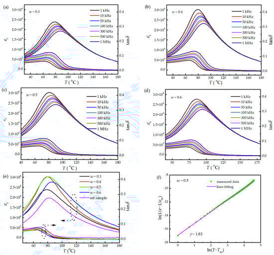 Temperature-dependent dielectric spectra of (1 − w)PMNT-wPSMNT ceramics with (a) w = 0.3, (b) w = 0.4, (c) w = 0.5, and (d) w = 0.6. (e) Temperature-dependent dielectric spectra of (1 − w)PMNT-wPSMNT ceramics and the reference sample at 1 kHz. (f) Linear fitting of dielectric behavior of (1 − w)PMNT-wPSMNT ceramics with w = 0.5 at 1 kHz according to Equation (1).