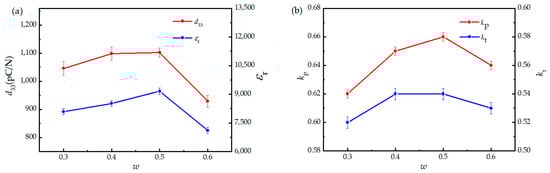 (a) Piezoelectric coefficient d33, relative dielectric permittivity ε33/ε0, and (b) electromechanical coupling factors kp and kt of (1 − w)PMNT-wPSMNT ceramics.