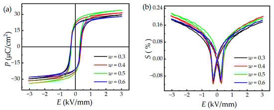 The hysteresis loops and field-induced strain plots of the (1 − w)PMNT-wPSMNT ceramics are shown in Figure 7. It can be seen that the loops had good rectangularity and symmetry, indicating that the materials have good ferroelectric properties. The coercive fields Ec varied slightly among ceramics, giving ~0.26 kV/mm. The remanent polarization Pr reached the maximum value of 34 μC/cm2 when w = 0.5, which is consistent with the piezoelectric and dielectric performance. Similarly, the sample with w = 0.5 exhibited the largest field-induced strain of 0.22%, as shown in Figure 7b. This is attributed to the equal ratio of the rhombohedral and tetragonal phases in the ceramic structure so that the domain structure exhibits a mixture of microdomains and macrodomains. It is of great significance to regulate the relationship between macrodomains and microdomains to enhance the performance of ceramics [50]. The butterfly curve is relatively thin, which indicates the small field-induced strain hysteresis, good repeatability, and fast response of the (1 − w)PMNT-wPSMNT ceramics [51]. This is very beneficial to the application of large displacement devices, such as atomic force microscopy, long-distance laser ranging calibration, submarine passive sonar, large displacement jacquard driver [52], and so on. The proposed method could precisely control the ratio of the two crystalline phases, and thus enhance the properties of the ceramics. Nevertheless, the process of this method is complex with a long experimental period, which needs to be modified for commercialization, e.g., to simplify the process for Component B. Moreover, as the low relative dielectric permittivity and high dielectric loss tangent of the materials are not suitable for miniature high-frequency devices [53], the formulation design and performance of the ceramics need to be further refined.