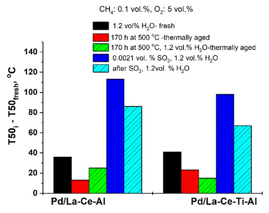 The difference between the measured T50 for the fresh and for the corresponding stability tested Pd/La2O3-CeO2-Al2O3 and Pd/La2O3-CeO2-TiO2-Al2O3 samples are shown in Figure 2.
