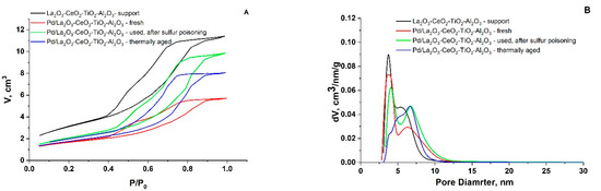 The adsorption/desorption isotherm and pore size distribution (PSD) of the synthesized La2O3-CeO2-TiO2-Al2O3 support and the fresh, used, after sulfur poisoning and thermally aged catalysts prepared by the sol–gel method are presented in Figure 3A,B.