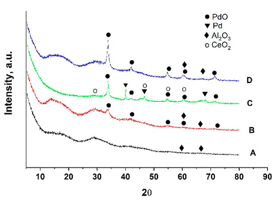 The pattern of fresh catalyst demonstrates the presence of the AlO(OH), γ-Al2O3, and PdO (ICDD-PDF 41-1107). The basic diffraction peak of palladium oxide is very small and broad, suggesting a significant degree of dispersion of the palladium across the catalytic surface. After catalytic tests, the phase composition of the support is changed. AlO(OH) is transformed to γ-Al2O3, which remains the primary component of the support along with the introduction of a CeO2-type phase (ICDD-PDF-81-792).