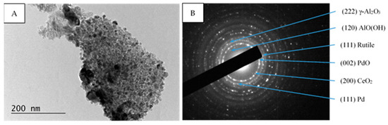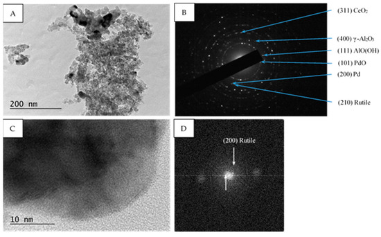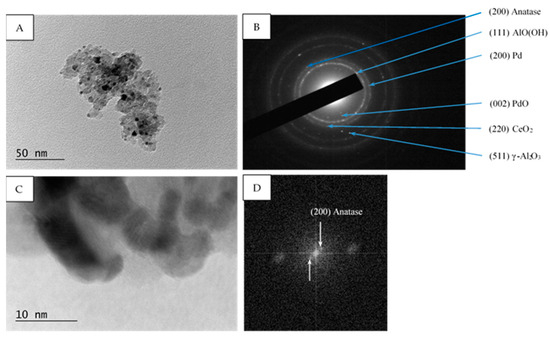 Within all samples (fresh, used, after sulfur poisoning, and thermally aged) the selected area electron diffraction (SAED) patterns show the presence of PdO (PDF-41-1107), Pd (PDF-46-1043), γ-Al2O3 (PDF-70-9085), AlO(OH) (PDF-83-2384) and CeO2 (PDF-81-0792), (Figure 6B, Figure 7B and Figure 8B). Additionally, in the Pd/La2O3-CeO2-TiO2-Al2O3-fresh sample the formation of TiO2—anatase (PDF-83-2243) was confirmed by the HRTEM and SAED analyses (Figure 6B,D), while in used, after sulfur poisoning and thermally aged samples, the TiO2—rutile (PDF-88-1175) and (PDF-87-0920) was detected (Figure 7B,D and Figure 8B).