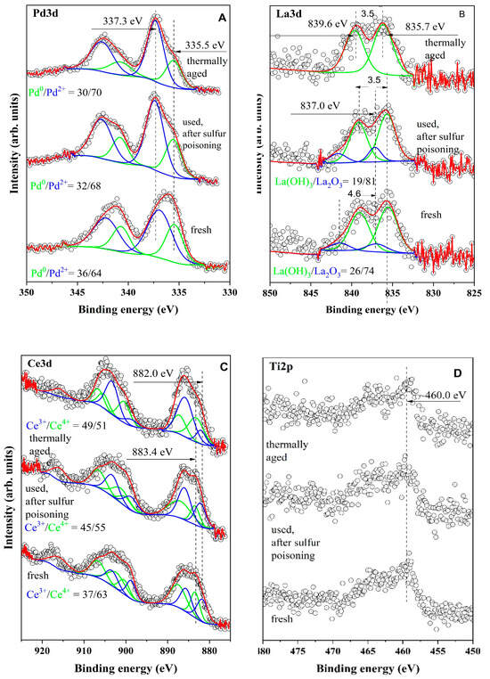 As can be seen from Figure 9B, the concentration of Pd2+ slightly increases in the used and thermally treated samples. A similar phenomenon was observed in our previous studies [36,37], and this effect is explained by the oxidation of Pd to PdO. In the case of the studied system Pd/La2O3-CeO2-TiO2-Al2O3, the variation of the surface concentration of Pd2+ is insignificant, which supports the stability of the catalysis.