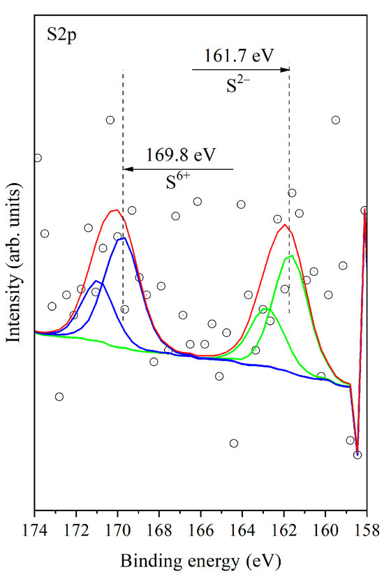 X–ray photoelectron spectra of S2p for Pd/La2O3-CeO2-TiO2-Al2O3-used, after sulfur poisoning catalyst. The open circles represents experimental data both oxidation states are in green (S2−) and blue (S6+). Because we are measuring 2p core level of sulfur it is doublet peak representing the standard spectra of each oxidation state. The red line is used for resulting curve of curve fitting procedure to be compared with experimental data.