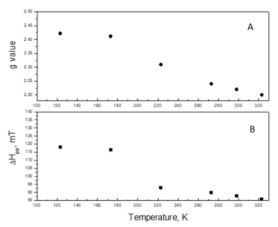 The variation of the g factor (A) and line width (B) of the EPR spectra changing in the recording temperature.