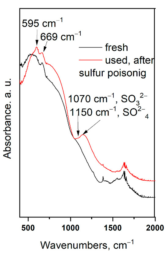 FTIR spectra of a fresh Pd/La2O3-CeO2-TiO2-Al2O3 sample and after the catalytic test with sulfur dioxide are presented in Figure 13. Low-resolved bands centred at 1150 cm−1 and 1070 cm−1 are visible in the IR spectra. The band centred at 1150 cm−1 is ascribed to the sulphates in bulk according to data in the literature [48]. There is no evidence of the presence of aluminium sulfate, either X-ray or TEM, which can be considered as evidence that the formed sulphates are amorphous.