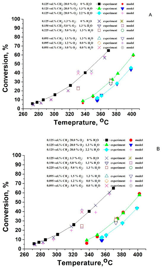 The catalytic activity study was performed by using a flow reactor under the following specified conditions: catalyst volume of 0.7 cm3 (0.5 cm3 catalyst sample and 0.2 cm3 quartz–glass particles with the same size as the catalyst), irregular shaped particles with a diameter of 0.45 ± 0.15 mm. The inner reactor diameter is 6.0 mm. The gaseous hourly space velocity (GHSVSTP) was 60,000 h−1. The inlet concentrations of reagents were varied as follows: CH4 concentrations: 5 × 10−2, 1.0 × 10−1 and 2.7 × 10−1 vol.%, O2 on levels of 0.9, 5.0 and 20.0 vol.%, additional H2O on levels of 0, 1.2 and 2.2 vol.%, and balance to 100 vol.% by N2 (4.6). The standard deviation of the experimental data was estimated based on six repeated measurements. Gas analysis was carried out by using of an on-line gas-analyzers for CO/CO2/O2 (Maihak-Sick Mod. S 710, V.1.31, Hamburg, Germany ), THC-FID (analyzer for total organic content in gas phase, Thermo FID-TG, SK Elektronik GmbH, Leverkusen, Germany) and for SO2 measurement (MultiGas FTIR Gas Analyzer 2030G, MKS Instruments Inc., Andover, MA, USA).