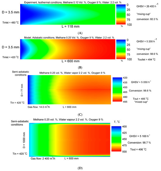 Experimentally measured conversion degrees and temperature profiles in a single monolithic channel at isothermal conditions (A); simulated conversion degrees and temperature profiles within a single adiabatic channel for ensuring of 99% methane conversion (B); pilot-scale simulation of methane combustion using the kinetic data, obtained at isothermal conditions (C); and full-scale reactor model for methane combustion accouning for the heat loss at the reactor wall (D).