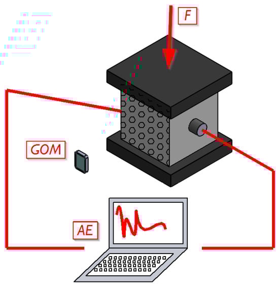 The cubic specimens were subjected to axial compression using a Zwick Roell testing machine. A schematic diagram and view of the test stand are shown in Figure 1. The compression speed was 0.1 MPa/s.