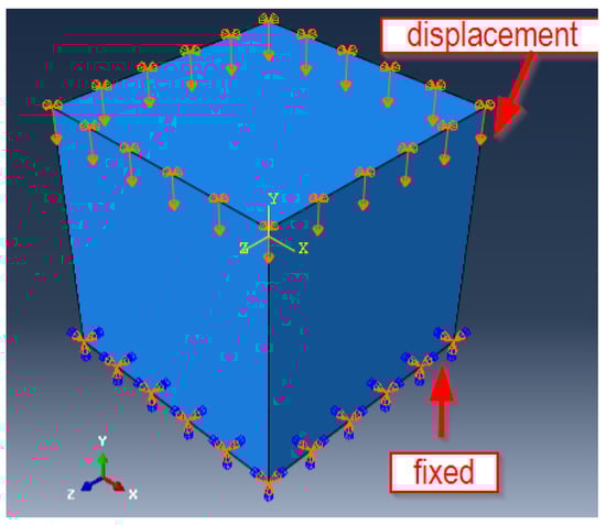 The results of the experimental tests served as the basis for the numerical calculations. Numerical models were developed for specimens identical to those used in the experimental tests. These were 150 × 150 × 150 mm cubes made of PP-fiber-modified concrete. The lower surface of the specimen was assumed to be fixed in the boundary conditions, while the displacement of the upper wall was applied (as shown in Figure 2). The displacement assumed in the numerical calculation program corresponded to the moment of occurrence of the maximum force during the compression tests of the specimens. An eight-node, three-dimensional finite element type C3D8R was used in the model [44]. The compression specimen model contained 8000 finite elements. The size of the smallest finite element was 7.89 × 7.89 mm. A material model in the form of the concrete plasticity model (CDP) was used in the numerical calculation program. Details relating to the material model used are shown in Table 1. The definition of the material model in the numerical calculations used the guidance provided in the papers [36,45,46,47,48,49,50,51,52]. This involved the definition of the stress–strain curve obtained in compression and tension tests of the material under analysis. An important aspect when carrying out numerical analyses is the possibility of verifying the results obtained, e.g., by comparing them with experimental results or with the results obtained from the analysis of real-time laboratory tests. For this reason, a videorejection of the specimen deformation process (DIC) was used in the experimental program. After the numerical model was developed, the modeled specimens were simulation-loaded with values identical to the experimental values. At characteristic moments (e.g., maximum test or failure force), the stress and strain values were read off in the inner regions of the specimens. The aim of this was to carry out the analysis according to a hybrid method of analysis: complementing the experimental results with numerical results and analyses using DIC to determine the quantities characterizing the failure process. Modeling of the specimens, simulation loading, and calculations were carried out using Abaqus ver. 6.12-2 [53].
