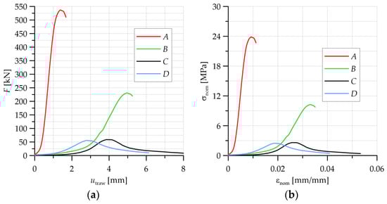 Experimental results of representative specimens: (a) force–displacement relationships and (b) nominal stress–strain relationships.