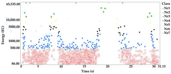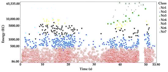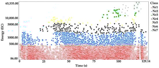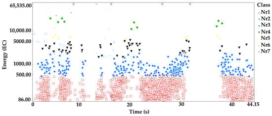 For the classification of AE signals, NOESIS v12 software is very often used, which is mainly based on the pattern recognition method, in two versions: an arbitrary class division (unsupervised), USPR, and a self-learning one, in which the class division is performed using pattern signals (supervised), SPR [34,36,41,42,43].