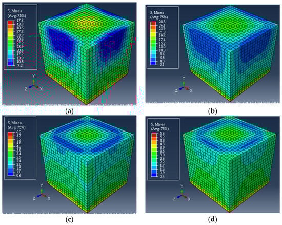 As the annealing temperature of the test specimens increased, there was a decrease in the nominal stress level but an increase in the strain at failure. In particular, a decrease in the maximum nominal stress level was clearly visible from an annealing temperature of 450 °C (material designated C). When observing the state of the specimens after the compression test for the specimen in the initial state (A) and for the annealing temperature of 300 °C (material B), there were fractures on the observed specimen front, but there was no clear shattering of the specimens (Figure 4a,b). Significant failure of the specimens after the compression test occurred for annealing temperatures of 450 °C (material C) and 600 °C; Figure 4c,d show shattering of the specimens into multiple pieces. The details and observations made during the compression test of the accepted specimens formed the basis for the development of the numerical models in the subsequent strength analyses.