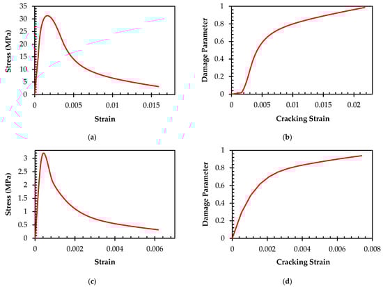 In the context of tensile loading, the uniaxial stress–strain behavior of concrete is simulated through a two-phase approach, as shown in Figure 1c. The first phase describes the linear elastic behavior of concrete until its tensile strength is reached. The second phase, which is characterized by the beginning and propagation of cracks in concrete, results in a nonlinear stress–strain relationship. This is important for improving the analysis and design of concrete structures, as it allows for a more near-true prediction of the performance of concrete under tensile loading. The initiation of damage in uniaxial tension within the CDP model is defined at the point of tensile strength, as displayed in Figure 1d.