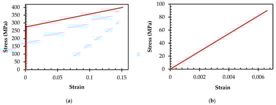 The behavior of steel was simulated using an elastic–plastic modeling approach [,]. The properties of concrete, steel, and bamboo utilized in this study were obtained from previous research studies [,]. The material behavior of steel reinforcement is characterized by both elastic and plastic behaviors, with the elastic behavior described by Young’s modulus and the plastic behavior defined by the post-yielding Young’s modulus. The characteristics of the plastic phase are represented by bilinear behavior, resembling the typical stress–strain relationship of reinforcement that is integrated into the model, as presented in Figure 2a. The mechanical response of bamboo reinforcement encompasses the linear response until its failure. Young’s modulus quantifies the linear behavior, while the failure behavior is delineated by the average strength, as noted by Qaiser et al. []. Figure 2b provides a visual representation of the stress–strain relationship observed in bamboo testing.